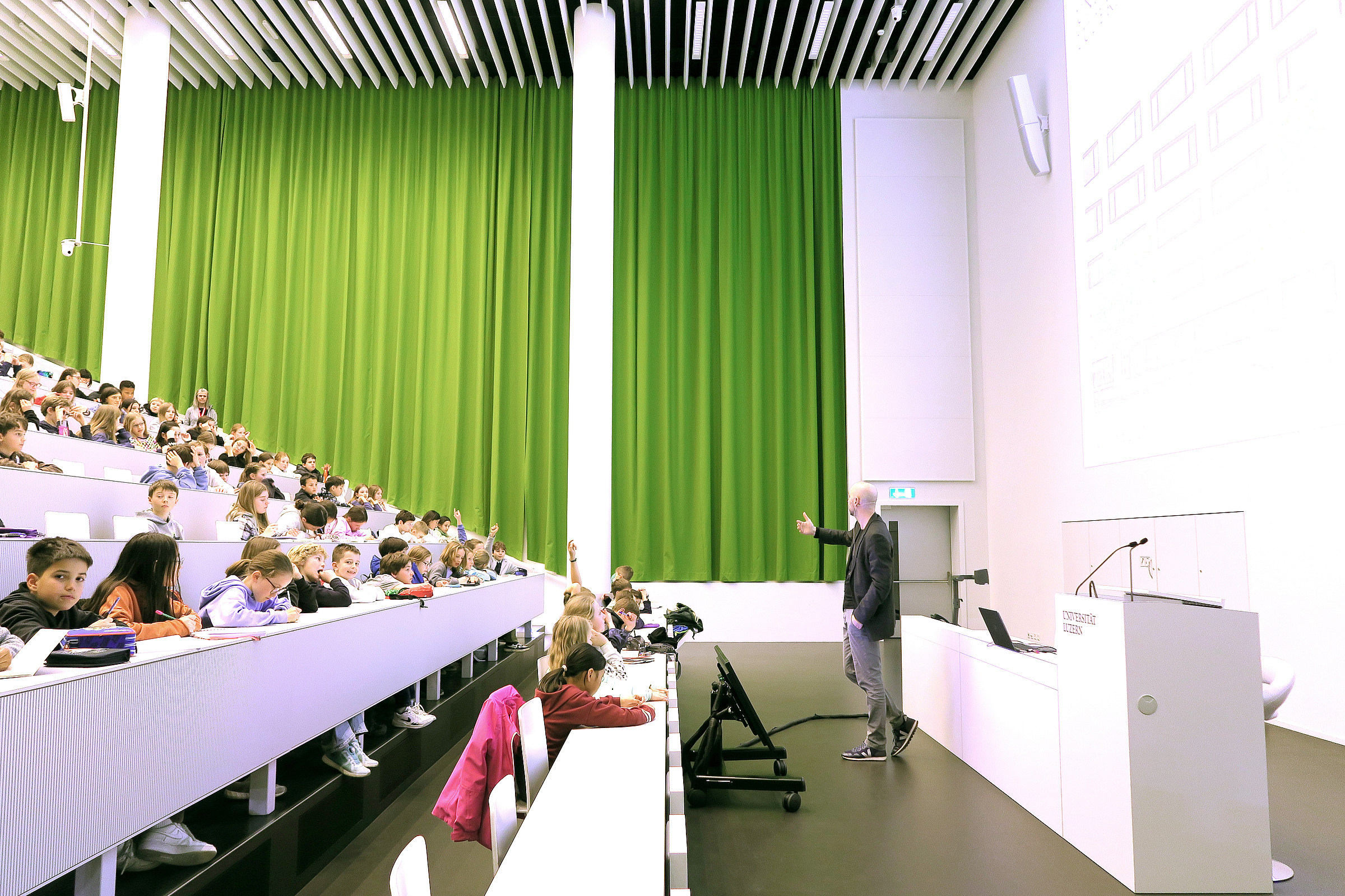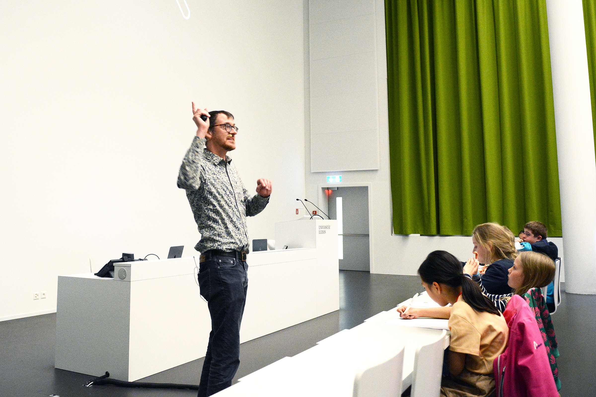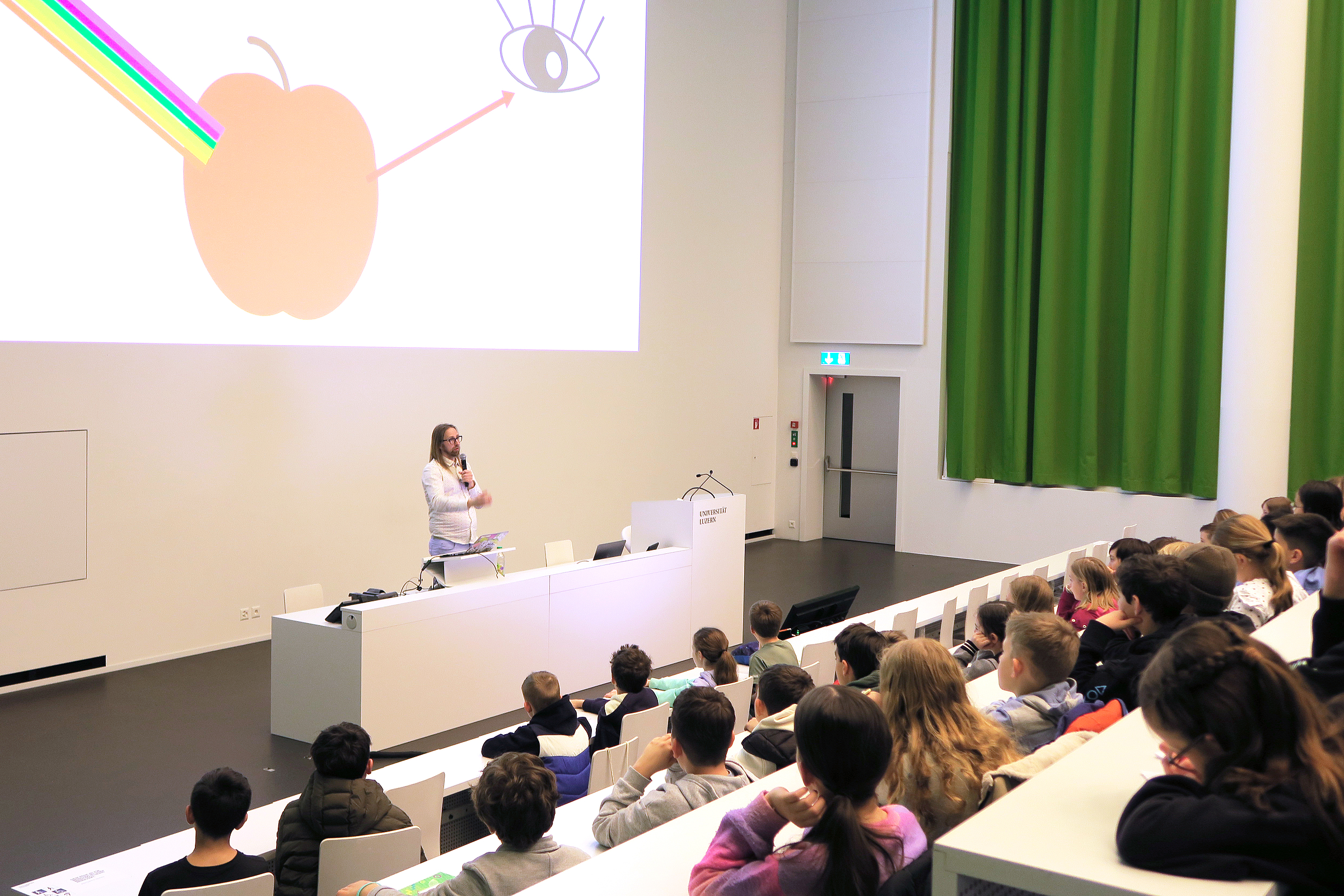 Die Kinderuni ist fast wie eine Universität für Erwachsene: Professoren und Professorinnen reden über Themen, zu denen sie viel wissen und sogar Bücher geschrieben haben. Ihr seid die Studentinnen und Studenten, kommt an die Uni, in den Hörsaal, hört zu und könnt auch Fragen stellen. Wir möchten euch die Türen öffnen zur Welt der Wissenschaft und euch Themen näher bringen, zu denen an der Uni Luzern geforscht wird.