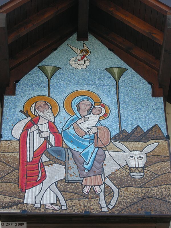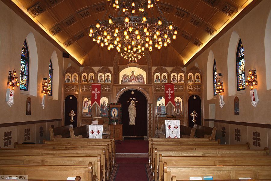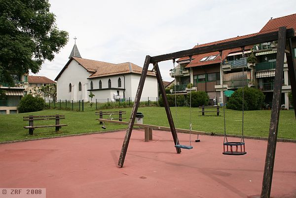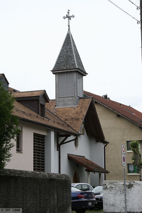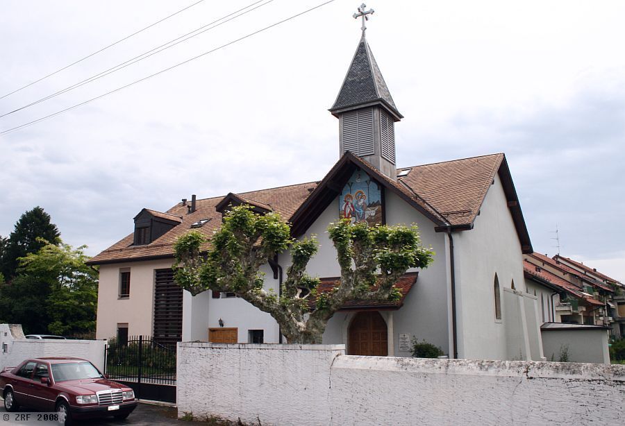 The train station Vernier-Meyrin is a short local train journey from Geneva's main station. Continuing on foot towards Meyrin along the Chemin du Grand Puits, passing some factories and later a residential area, one finally turns left onto the Rue Virginio-Malnati. There is no sign of a Coptic church at first, but after 150 metres one comes across a small turret covered in shingles on one of the roofs. One is now standing before a building complex made up of two annexes. It immediately becomes clear a two-story apartment building is attached to the church, in keeping with the surrounding buildings. Quite unlike the eye-catching church, with its grand wooden entrance and pillared porch. A few steps further into the entrance reveal a sign in Arabic inviting visitors to enter.