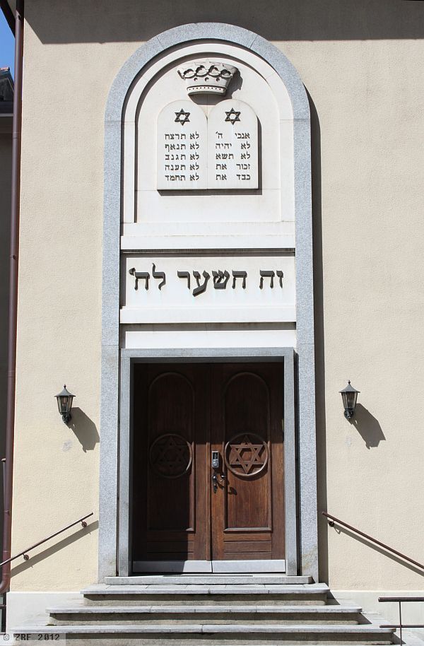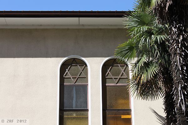 Above the entrance, a black inscription in relief can be seen in Hebrew letters, and above that two tablets, also containing Hebrew letters and a crown – the tablets containing the Ten Commandments, a reference to the Mosaic tradition which is cultivated here. To the right of the entrance, running nearly the whole height of the building, are two slender arched windows with the Star of David above them (Magen David in Hebrew). The same symbol can be seen on both wings of the wooden entrance door. There is no doubt that we are standing in front of the synagogue of the Comunità Israelita Lugano.