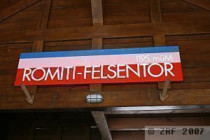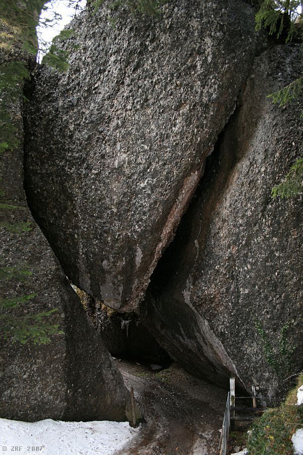Romiti Felsentor station. We find ourselves halfway between Vitznau and the destination for most of the other passengers: the summit of Mount Rigi. Our train journey, however, ends here. Only a few passengers get out at this apparently rarely used stop. After about ten minutes down the valley trail, three huge rocks block the way, as if after a rockfall. A closer look, however, reveals that the stones are leaning against each other in such a way as to create a passageway, the «Felsentor», or «stone gate».