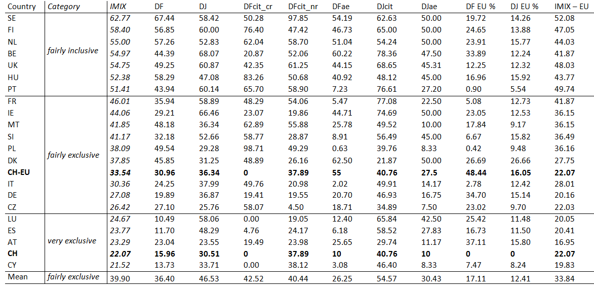 Furthermore, we take into account the two possible roads to electoral inclusion: access to citizenship (more conservative), and alien enfranchisement (more progressive). We give more weight to access to citizenship, which is the dominant and more conservative option. The more progressive one’s outlook, the more weight can be given to alien enfranchisement. We provide disaggregated data so the user can choose these weights her- or himself.
