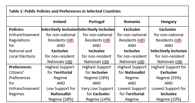 Portugal represents the inclusive trajectory best. It pursues a selectively inclusive policy towards nR, by including particular nR conditioned by the principle of reciprocity. This leads to a situation where Brazilian residents have voting rights on the national and local level, and many other residents – even many non-EU citizens – have voting rights on the local level. Portugal complements this rather inclusive policy towards nR with inclusive policies and practices towards rN. Such a regulatory regime that shows openness in both directions is mirrored by the strongest support that such a generally inclusive regime receives among citizens in Europe (28%). This information is summed up in Table 1 – for more details and further sources see next section.