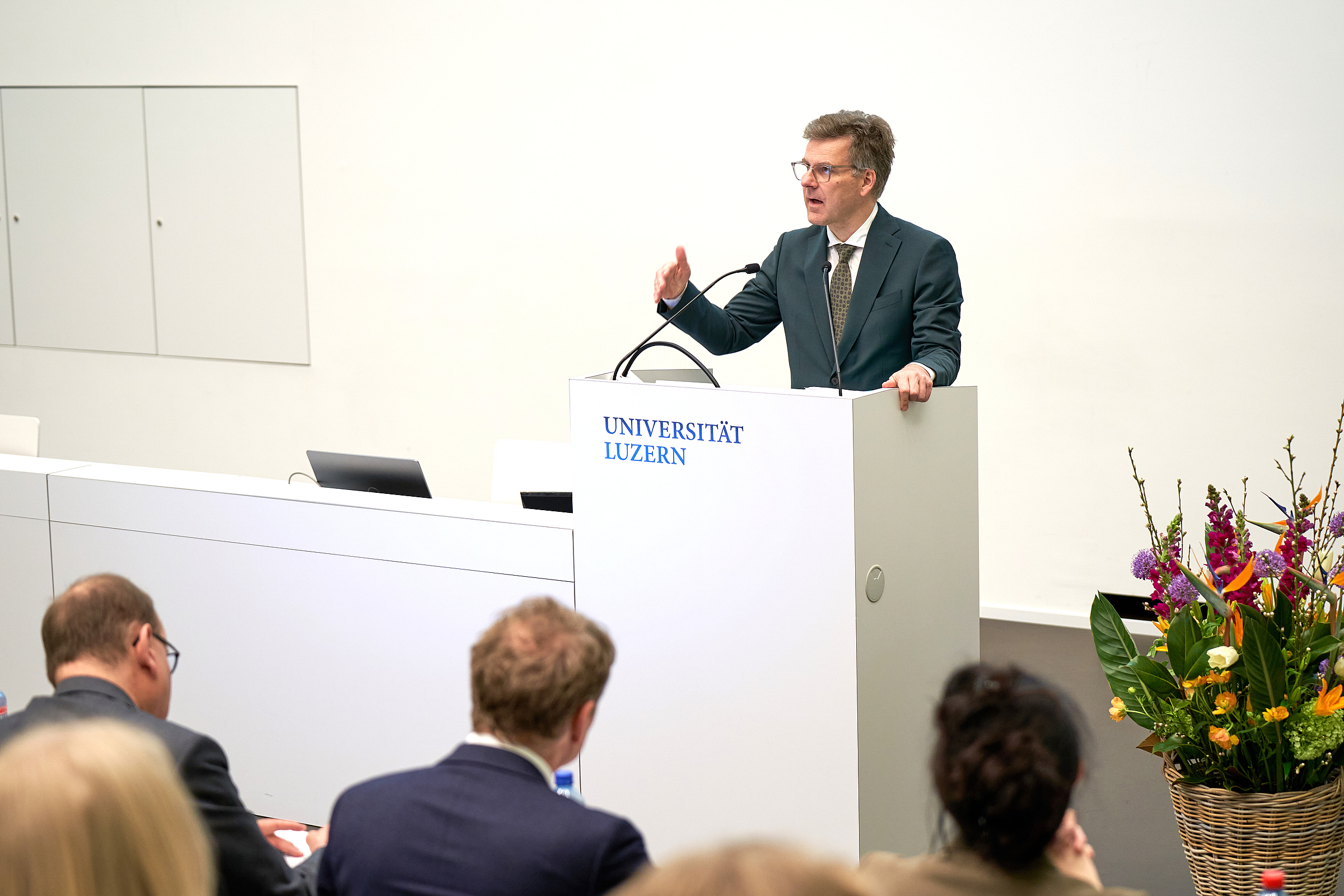 Im Rahmen der nunmehr achten «Presidential Lecture» wurde auch das «Center for Climate Politics, Economics and Law» eröffnet. Das neue Zentrum unterstützt und vernetzt die Forschung und Lehre in den Bereichen Klimarecht, Klimaökonomie und Klimapolitik. Getragen wird es gemeinsam von der Rechtswissenschaftlichen, von der Kultur- und Sozialwissenschaftlichen sowie von der Wirtschaftswissenschaftlichen Fakultät. Die Lehrtätigkeit wurde im vergangenen Herbst mit dem Master in Climate Politics, Economics and Law (CPEL) erfolgreich gestartet. Prof. Dr. Lena Maria Schaffer, Co-Direktorin des CPEL und Professorin für Politikwissenschaft mit Schwerpunkt Inter- und Transnationale Beziehungen, erläuterte an der Eröffnungsrede, dass mit diesem neuen Zentrum an langfristigen Lösungsansätzen für die gesellschaftlichen Herausforderungen durch den Klimawandel geforscht werde.