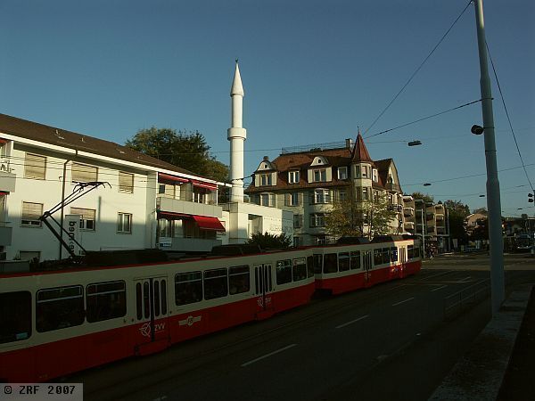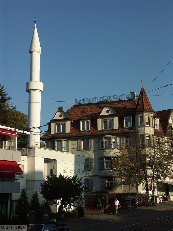 Fährt man in Zürich mit der Forchbahn in Richtung Rehalp, so zeigt sich unmittelbar vor der Station Balgrist ein weisser Pfeiler. Er wächst aus einem kleinen, ebenfalls weissen, würfelförmigen zweistöckigen Bau heraus und hebt sich an sonnigen Tagen mit seiner kegelförmigen Spitze scharf gegen den blauen Himmel ab. Wie eingegossen schmiegt sich die zierliche Moschee der Ahmadiyya-Bewegung direkt an eine Häuserreihe alltäglicher Mietwohnungen. Für die Anwohner ist sie längst zur Selbstverständlichkeit geworden.