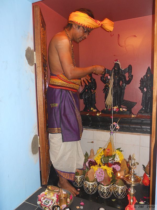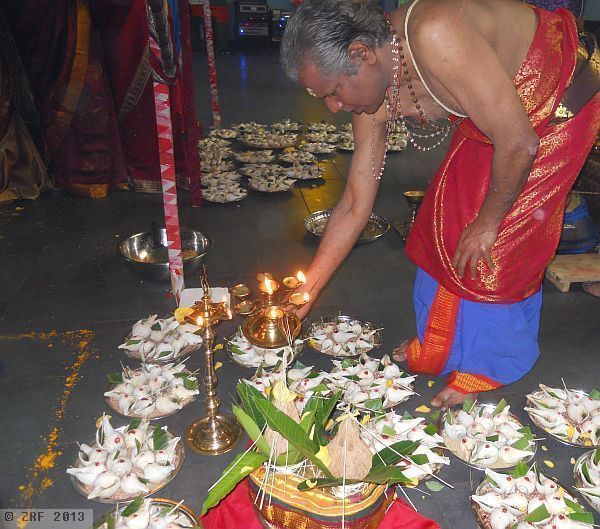 Im Frühjahr 2013 war es schliesslich soweit. Am 14. März begannen zehn Priester, aus der Schweiz und dem Ausland angereist, mit den ersten Ritualen. Am Sonntag, 17. März, fand der Höhepunkt statt, die Übergiessung des vimanam, des hinteren Tempelturms, der sich genau über dem Hauptschrein der Göttin Sri Manonmani erhebt. Nach sieben Wochen mit weiteren besonderen Ritualen, fand die Einweihungszeit mit dem Fest der 1008 Meeresschnecken, bei dem tatsächlich 1008 Gehäuse der Echten Birnschnecke (Turbinella pyrum, auch Hinduglocke genannt) verwendet wurden, ihr Ende.