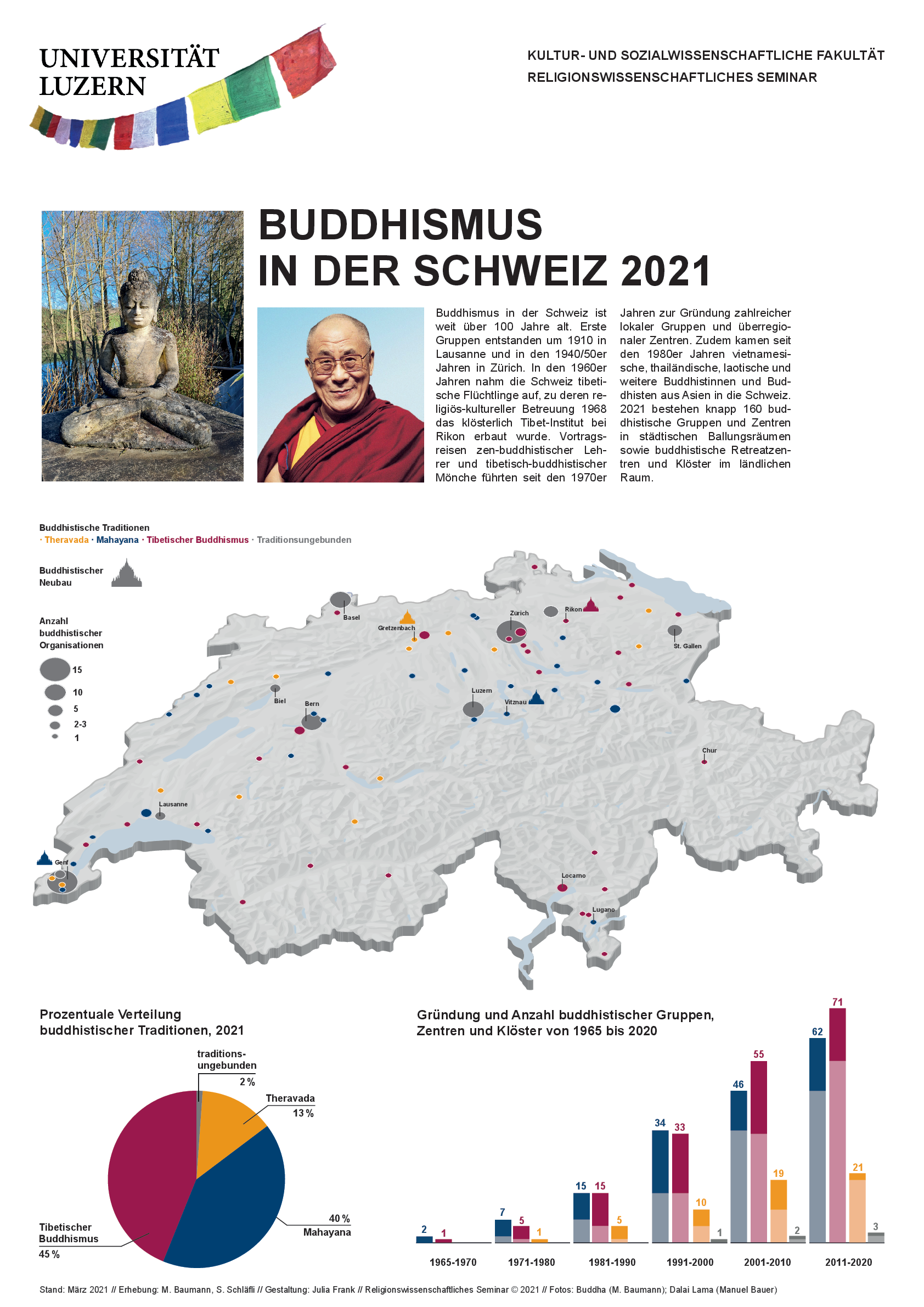Das Übersichtsblatt zeigt die geographische Verteilung buddhistischer Zentren in der Schweiz und das Wachstum ihrer Anzahl über die letzten fünfeinhalb Jahrzehnte hinweg.