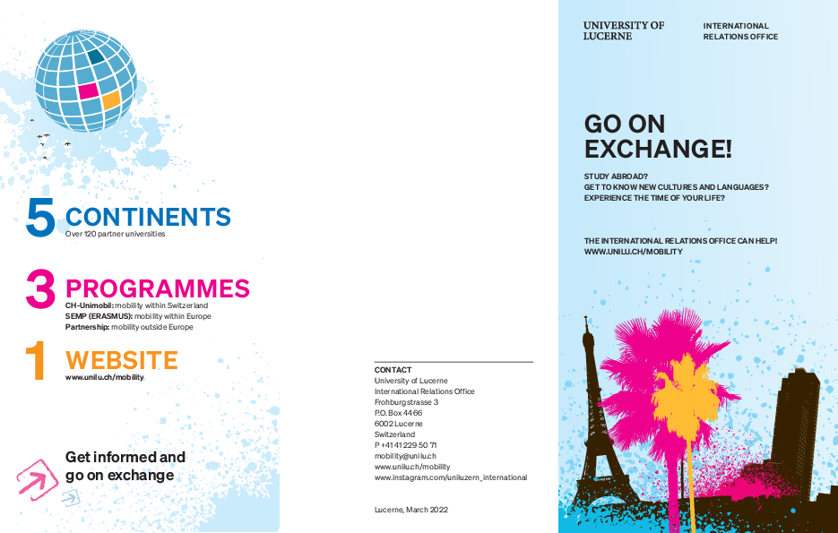 Finden Sie hier Informationsmaterial des International Relations Office (IRO) . Es kann beim IRO bestellt werden: international@unilu.ch.