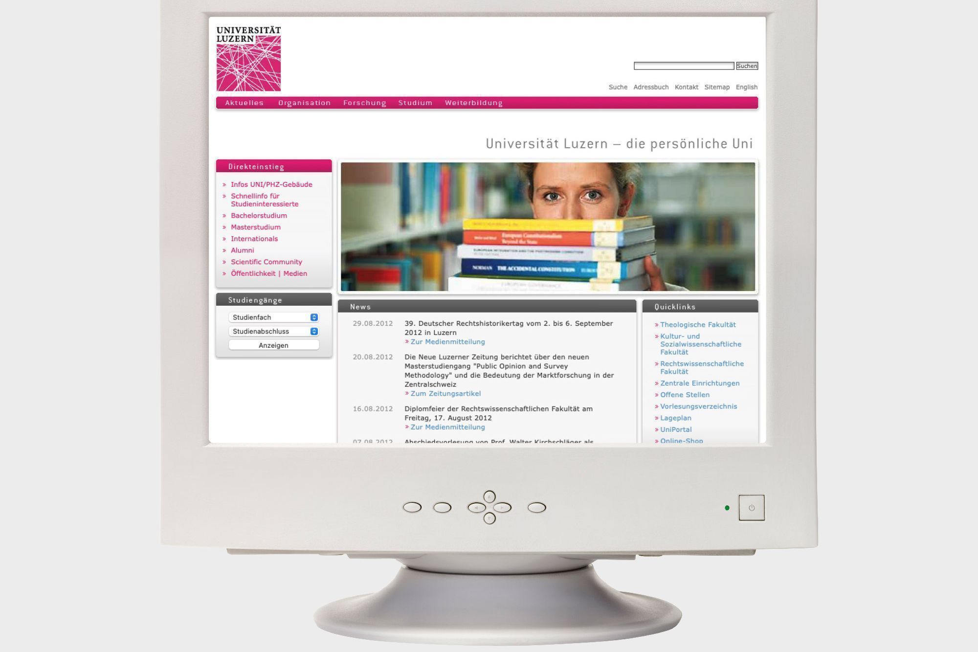 Anfang 2021 ist www.unilu.ch, die Website der Universität Luzern, einer Rundumerneuerung unterzogen worden. Seither präsentiert sie sich in einer moderneren Optik und mit vereinfachter Navigation, die insbesondere der immer breiteren Nutzung auf Smartphones und Tablets Rechnung trägt. Unlängst hat es das Relaunch-Projekt beim «Best of Swiss Web 2022»-Award auf die Shortlist geschafft. Ein Blick auf die vorletzte Version, die 2006 live ging und bis 2014 mehr oder weniger unverändert blieb (Bild), illustriert, wie rasant die Entwicklungen im Bereich des Website-Designs vonstattengehen und was die heutigen Anforderungen sind: «lightes» Layout, hoher Bildanteil statt Textwüste, übersichtliche und intuitive Benutzerführung, optimale Darstellung ebenfalls auf mobilen Geräten und eine gute Barrierefreiheit.