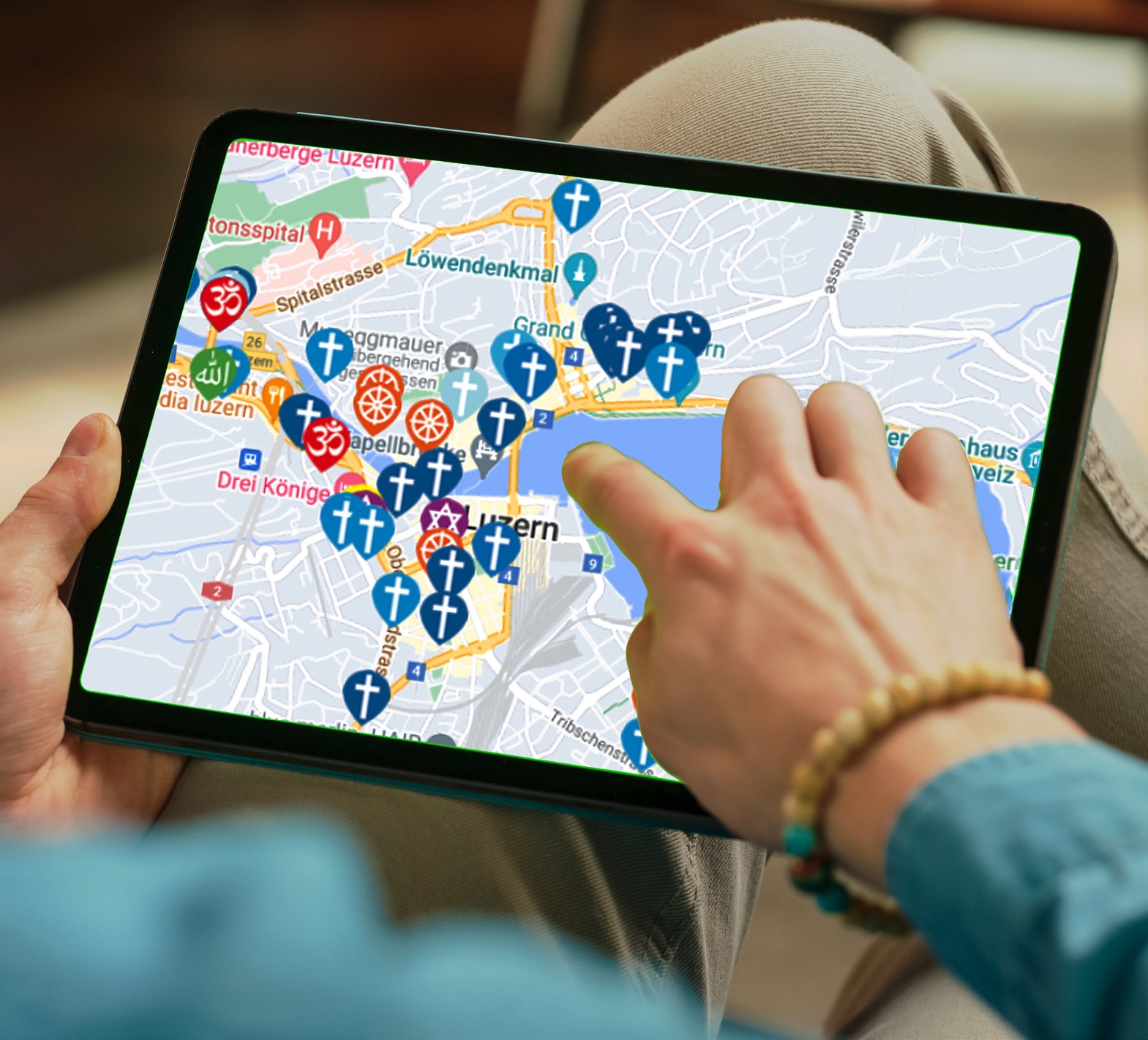 Die interaktive Karte des Projekts «Religionsvielfalt im Kanton Luzern» macht es augenfällig: Religiöse Gemeinschaften sind über das ganze Kantonsgebiet verteilt. Die römisch-katholische und weitere christliche Traditionen, dargestellt durch tropfenförmige Markierungen in verschiedenen Blautönen mit weissem Kreuz, dominieren gleichmässig – bis auf den Ballungsraum Luzern. Hier wird das Bild bunter durch orange Symbole (buddhistisch), grüne (islamisch), violette (jüdisch) und gelbe (weitere). Grössere Vielfalt in urbanem Raum – das war zu erwarten. Und doch ist diese Vielfalt vielen unbekannt, da öffentlich zumeist wenig sichtbar.