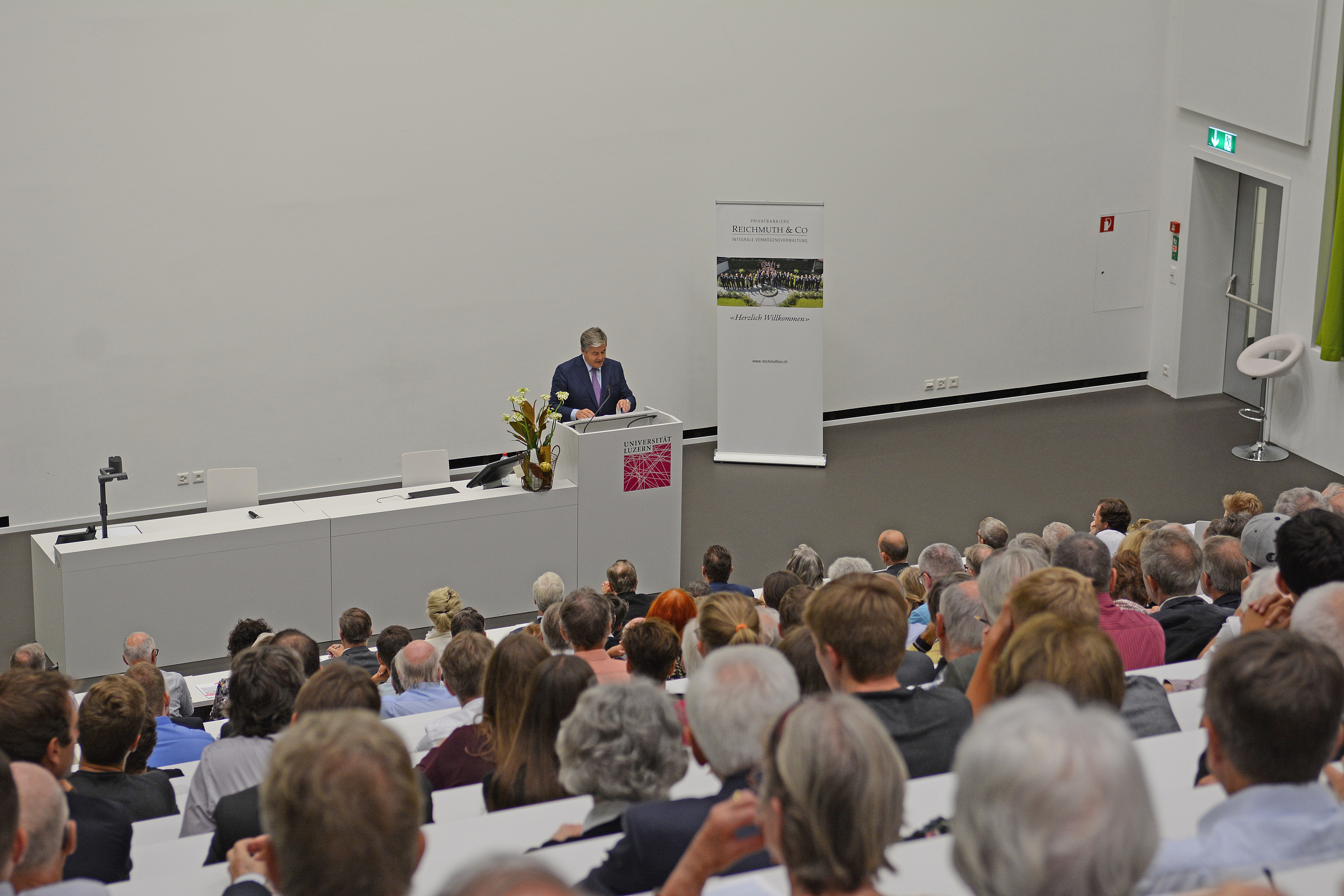 Der Vortrag von Dr. Josef Ackermann fand im Rahmen der Reichmuth & Co Lectures statt – eine Vortragsreihe der Wirtschaftswissenschaftlichen Fakultät, an der Persönlichkeiten aus Wirtschaft, Politik und Wissenschaft zu aktuellen Themen wie dem Euro, der Masseneinwanderungsinitiative, der Schuldenbremse oder der Geldpolitik referieren.