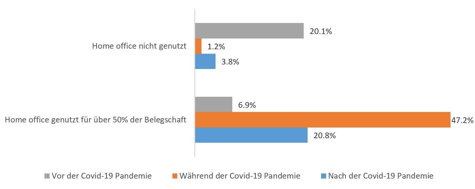 Anders als etwa in den USA können in der Schweiz im Zuge der abflachenden Corona-Pandemie keine Hinweise auf eine «Great Resignation» festgestellt werden. Im Gegenteil berichten Unternehmen sogar, dass die freiwillige Fluktuation leicht abgenommen habe; sie beträgt im Schnitt 7 Prozent. Nichtsdestotrotz hat die Pandemie das HRM in Organisationen stark beeinflusst: So nahm etwa die interne Kommunikation stark zu. Dies, um den veränderten Erwartungen der Mitarbeitenden in Zeiten der Pandemie gerecht zu werden und um die emotionale Bindung aufrechtzuerhalten. In der internen Kommunikation ist ausserdem ein Digitalisierungsschub zu beobachten: In 76 Prozent der Unternehmen werden elektronische Kommunikationskanäle häufiger als vor der Pandemie genutzt. In rund 31 Prozent der Firmen hat die direkte Kommunikation sowohl über den direkten Vorgesetzten als auch über die Geschäftsleitung zugenommen. Während zirka 80 Prozent der Unternehmen bereits vor der Pandemie ihren Mitarbeitenden Homeoffice-Möglichkeiten angeboten haben, sind es aktuell 96,2 Prozent (siehe zum Thema auch untenstehende Grafik).