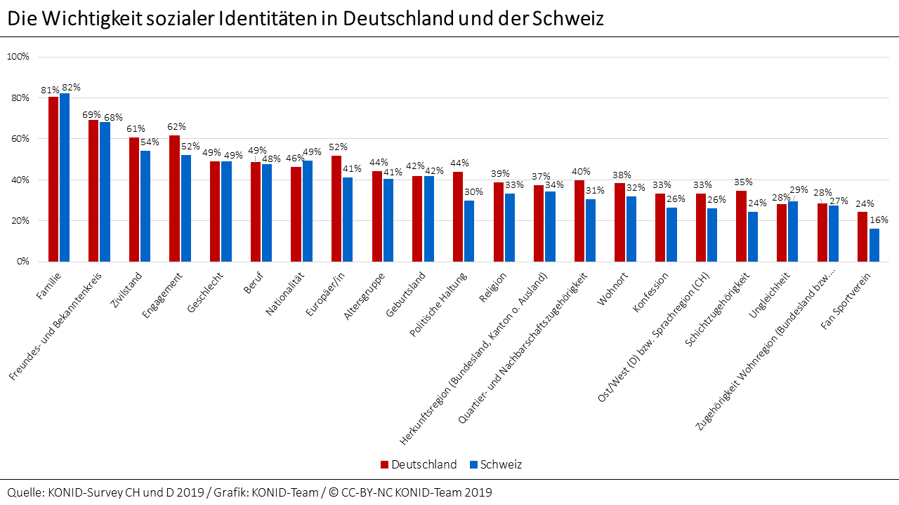Religion ist demnach eine wichtige, aber nicht die wichtigste soziale Identität. Die Familie etwa wird von über 80 Prozent und der Freundes- und Bekanntenkreis von knapp 70 Prozent der Befragten als wichtig eingestuft. Religion folgt im Mittelfeld, noch vor dem Herkunftskanton oder der Sprachregion.