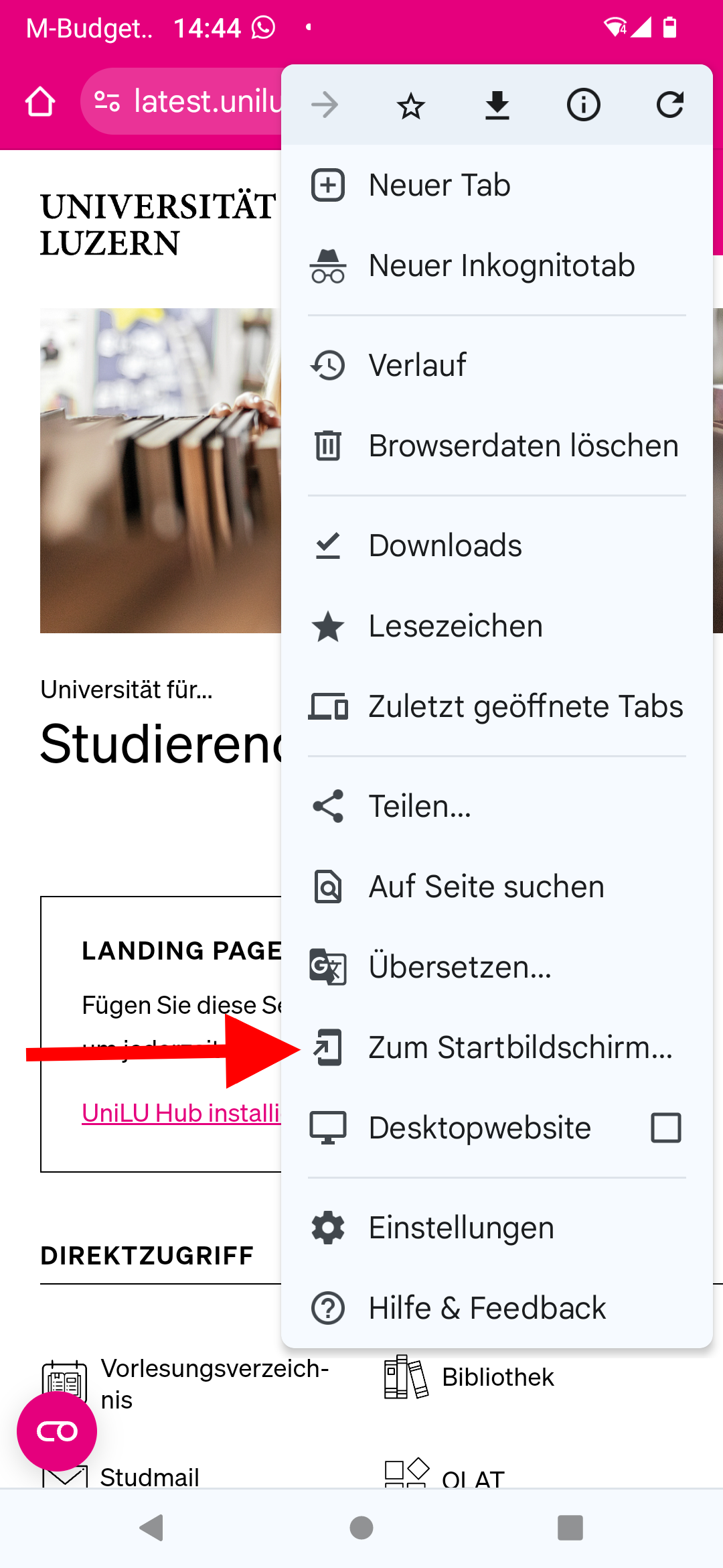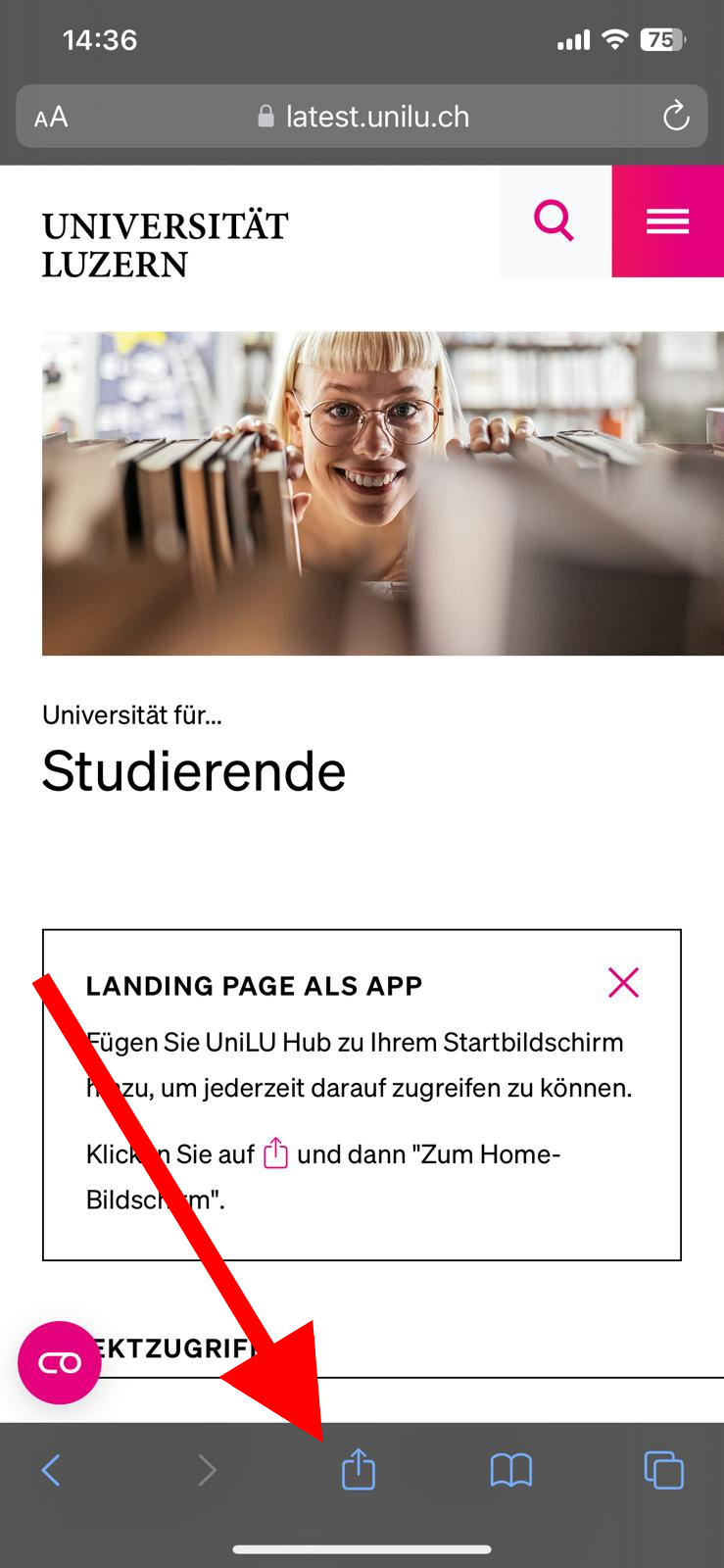 Um zur Web-App zu gelangen, muss zuerst die Seite «Universität für Studierende» mit dem Handy im Browser aufgerufen und diese auf dem Home-Bildschirm des Handys gespeichert werden. Beim ersten Aufruf der Seite erscheint eine Box mit entsprechenden Anweisungen. Alternativ kann die Seite über das Browser-Menu (Android) oder das Upload-Symbol (Apple) gespeichert werden.