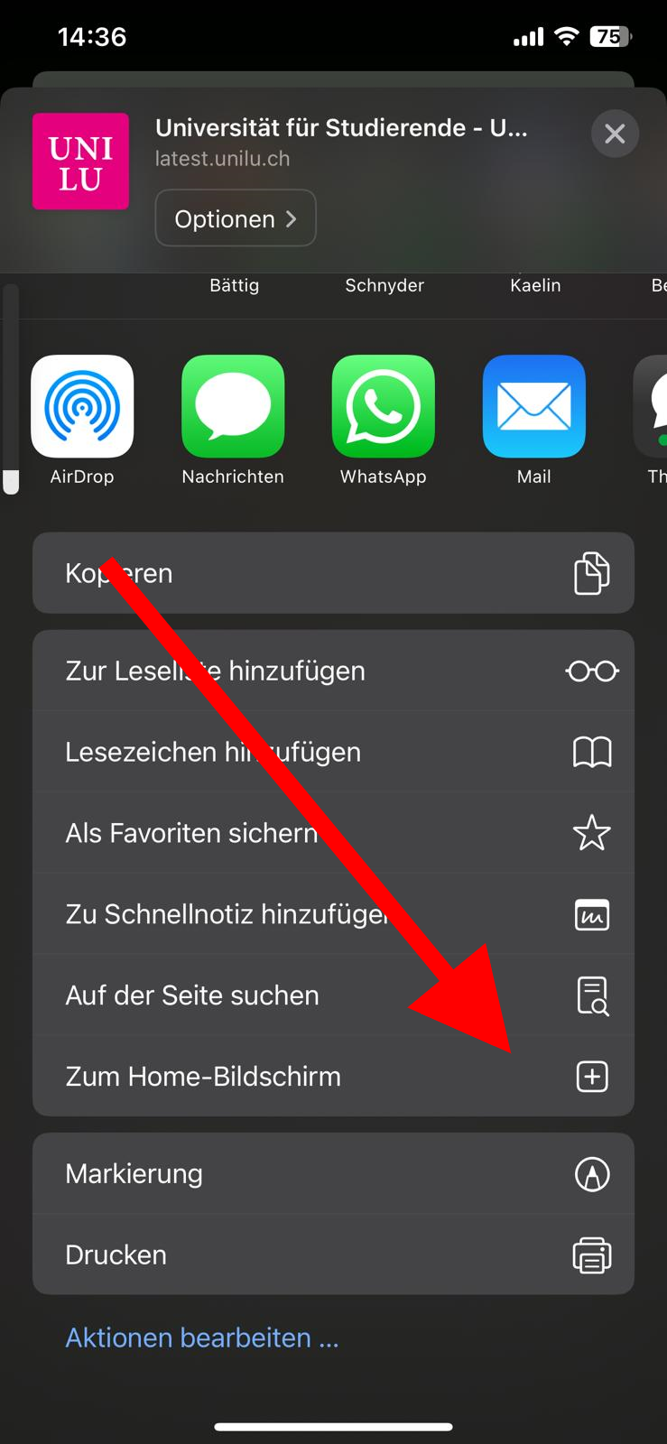 Die Seite «Universität für Studierende» ist neu als Web-App verfügbar. Damit können Studierende einfach und direkt vom Home-Bildschirm des Handys auf Infos zum Studium und zum Uni-Leben zugreifen.