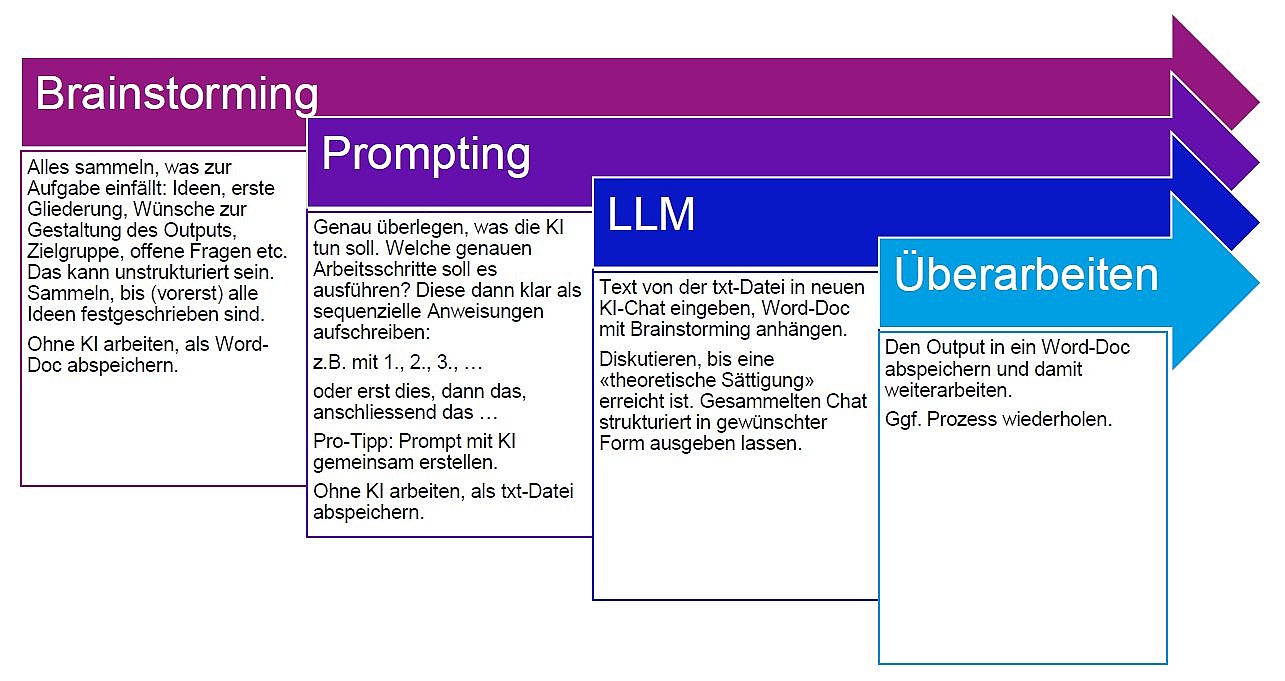 4-Schritte-Workflow: Brainstorming – Prompting – LLM – Überarbeiten. Siehe Grafik unten. So bleibt die eigene Leistung, die eigene Kreativität, im KI-Output. Und man erkennt schnell, was die KI kann – und was nicht.