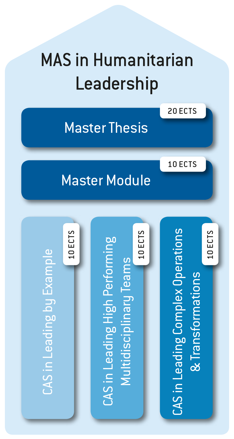 Nach erfolgreichem Bestehen der drei CAS Kurse besteht die Möglichkeit am Mastermodul teilzunehmen, eine Masterarbeit zu verfassen und den Abschluss «Master of Advanced Studies in Humanitarian Leadership» zu erlangen.